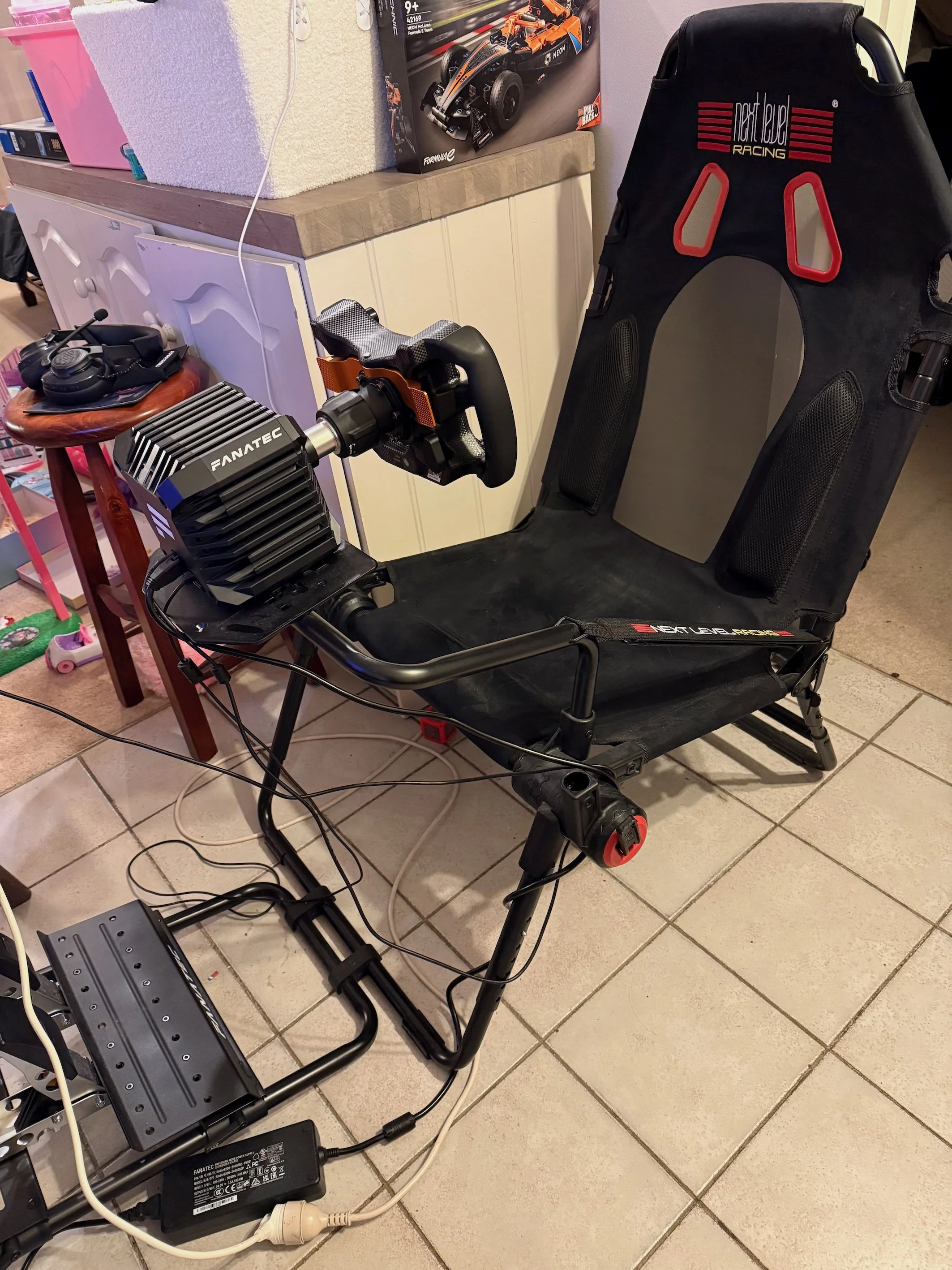 At the heart of it is a Next Level Racing foldable cockpit — which, let’s be honest, isn’t actually folded. I originally picked it because I thought I’d pack it away between sessions. But in practice, it now lives full-time near the kitchen, wedged between cabinets and a few stray toys. It’s technically portable, but the reality of racing regularly means it’s easier to leave it set up and ready.